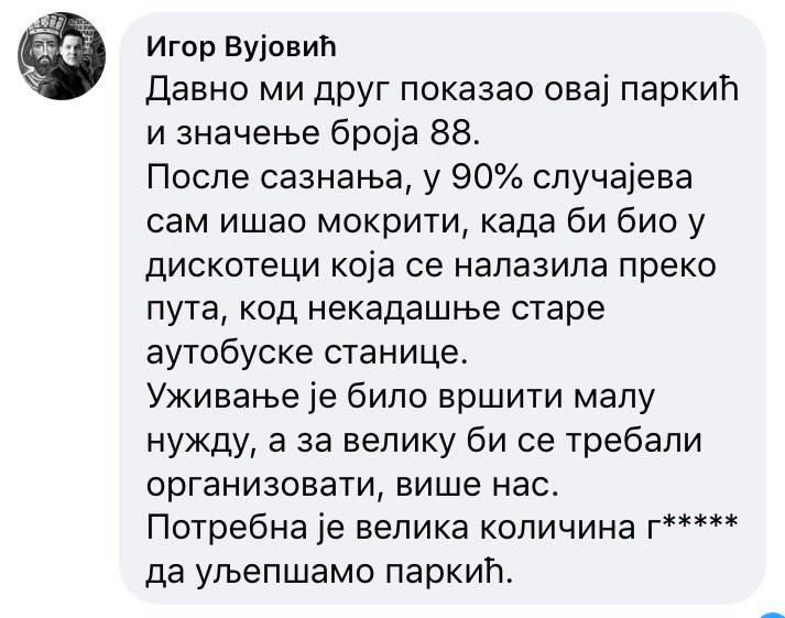 Naime, kako bi dokazao svoje srpstvo i antikomunizam u debati koja se vodila oko parkića u naselju Ložiona, u kojem se od 1980. godine nalazi iskopan broj 88, a u kojem su sađene ruže koje simbolišu godine života Josipa Broza – Tita, javno se “pohvalio” gdje je često volio da svrati i vrši malu nuždu, te pozvao na organizovano vršenje velike nužde.