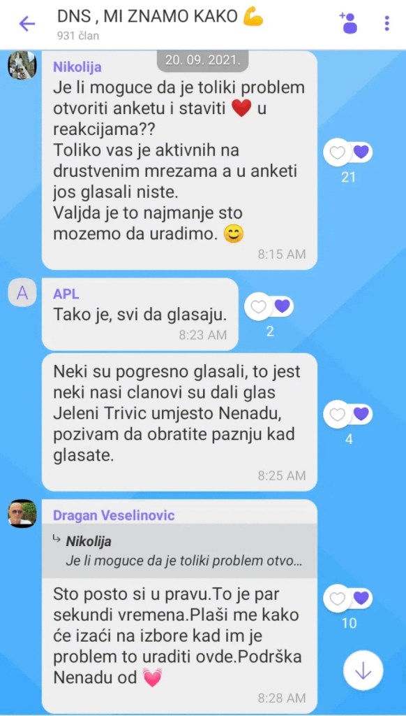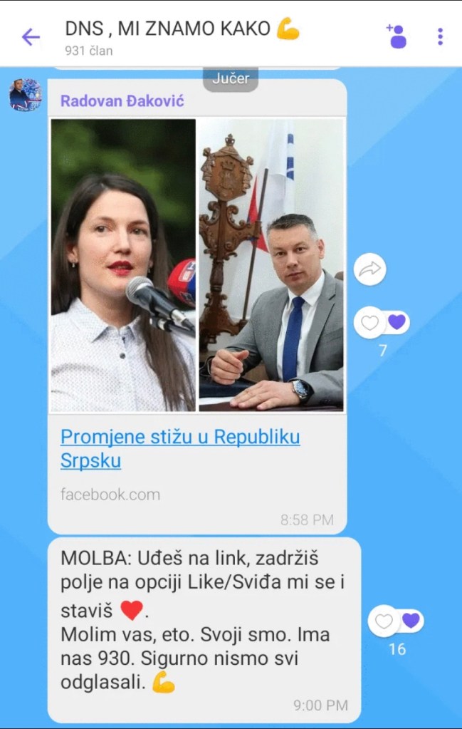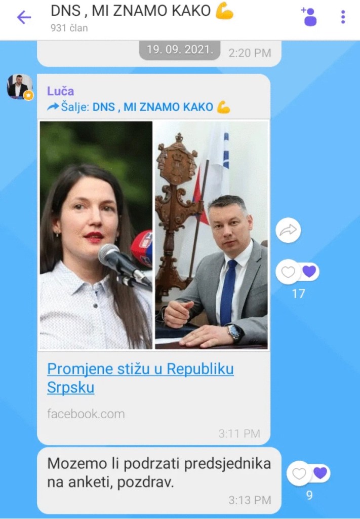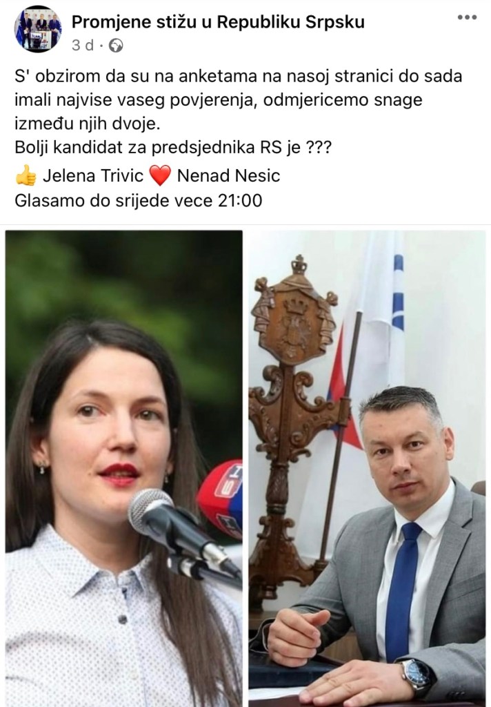 Facebook stranica pod nazivom “Promjene stižu u Republiku Srpsku” koja je pod kontrolom Demokratskog Narodnog Saveza objavila je anketu u kojoj se nalaze Nenad Nešić i Jelena Trivić, a tiče se pitanja ko je bolji kandidat za funkciju predsjednika Republike Srpske.