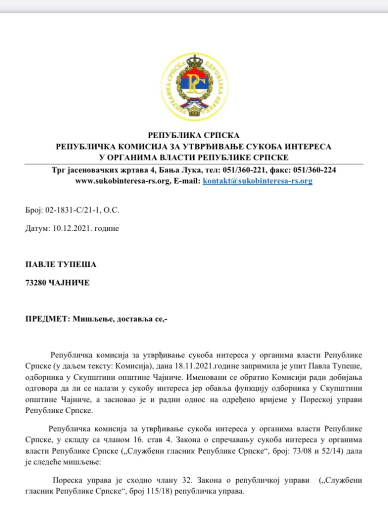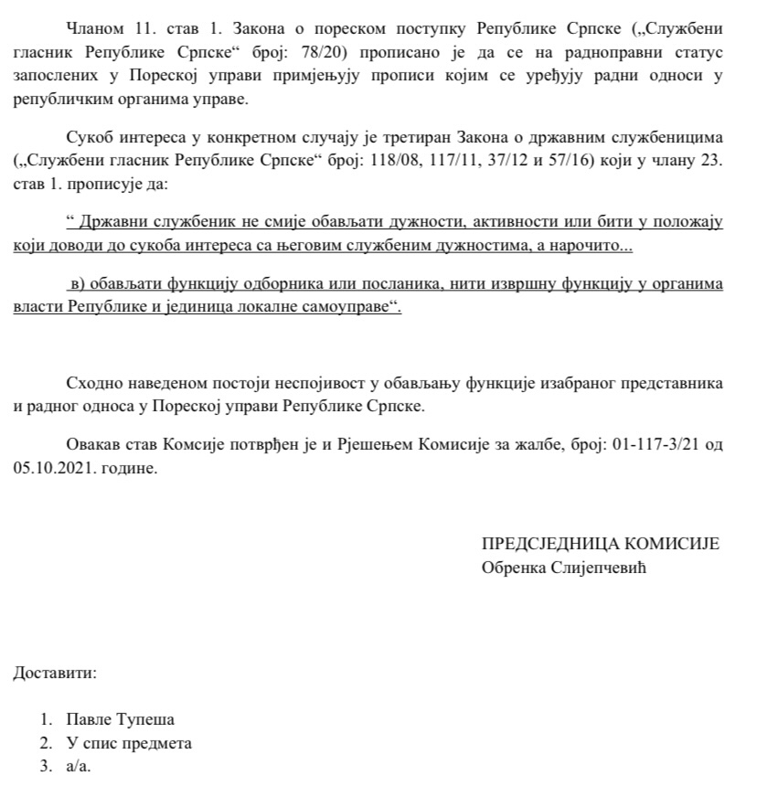 Tvrdnju da ne može istovremeno biti zaposlen u Poreskoj upravi i biti odbornik, Republička komisija za utvrđivanje sukoba interesa u organima vlasti Republike Srpske je potvrdila 10.12.2021. godine u predmetu pod brojem 02-1831-C/21-1, O. C.