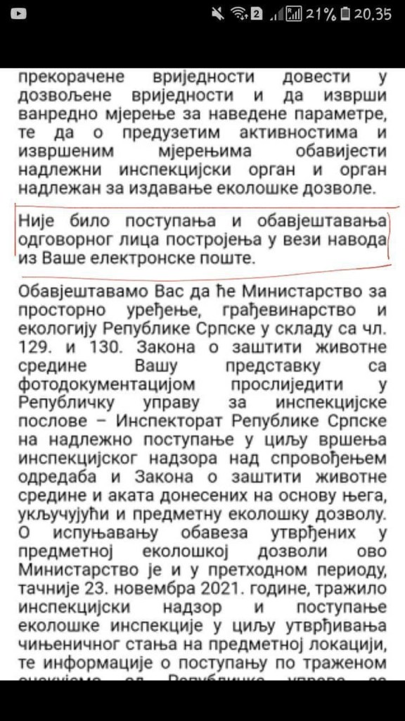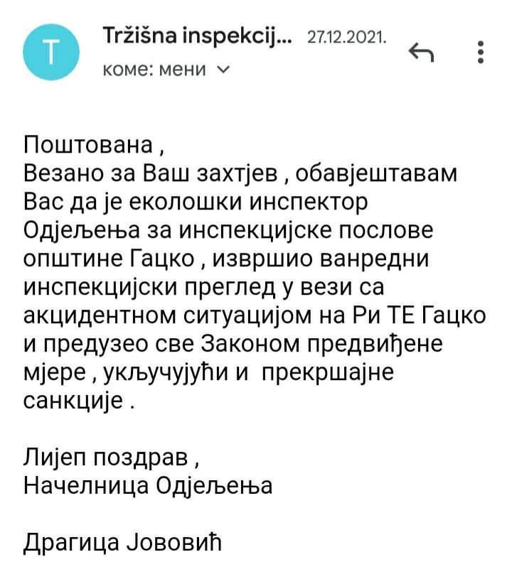 Po predstavci kojom sam tražila vanredni inspekcijski nadzor, u obavještenju načelnice Odjeljenja za inspekcijske poslove (Dragice Jovović) koje sam dobila 27.12.2021. godine, ekološki inspektor (Lazar Okiljević) preduzeo je sve Zakonom predviđene mjere, ČAK i prekršajne sankcije. To bi možda trebalo da nam bude dovoljno, dok pepeo i emisije zagađujućih čestica još uvijek izlaze iz ovog subjekta? Zapisnik koji je napravljen u toku nadzora, u zemlju je propao. Kao podnosioci predstavke, niti ja kao fizičko lice, niti Centar za životnu sredinu, zapisnik nismo još uvijek dobili. Šta je to inspektor zatekao u preduzeću čiji načini poslovanja nisu dostupni organizacijama i građanima, iako moraju poslovati transparentno? Da li na ovakav način funcioniše ta naša, „pravna“ država?