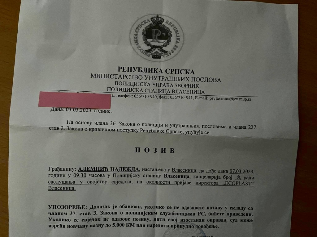 Poziv su, između ostalih, dobile i majka i kćerka, Nadežda i Branka Alimpić, od kojih je mlađa uključena u akciju prikupljanja potpisa protiv izgradnje objekta koji će “spržiti” 288 tona otpadne plastike dnevno, a starija, vjerovatno, u svojstvu majke koja bi po njihovim procjenama trebala imati ulogu ponavljača rečenice: “A što ti to treba u životu, okani se gluposti, ne zamjeraj se, vidiš da se i policija raspituje za to što radiš. . .”
