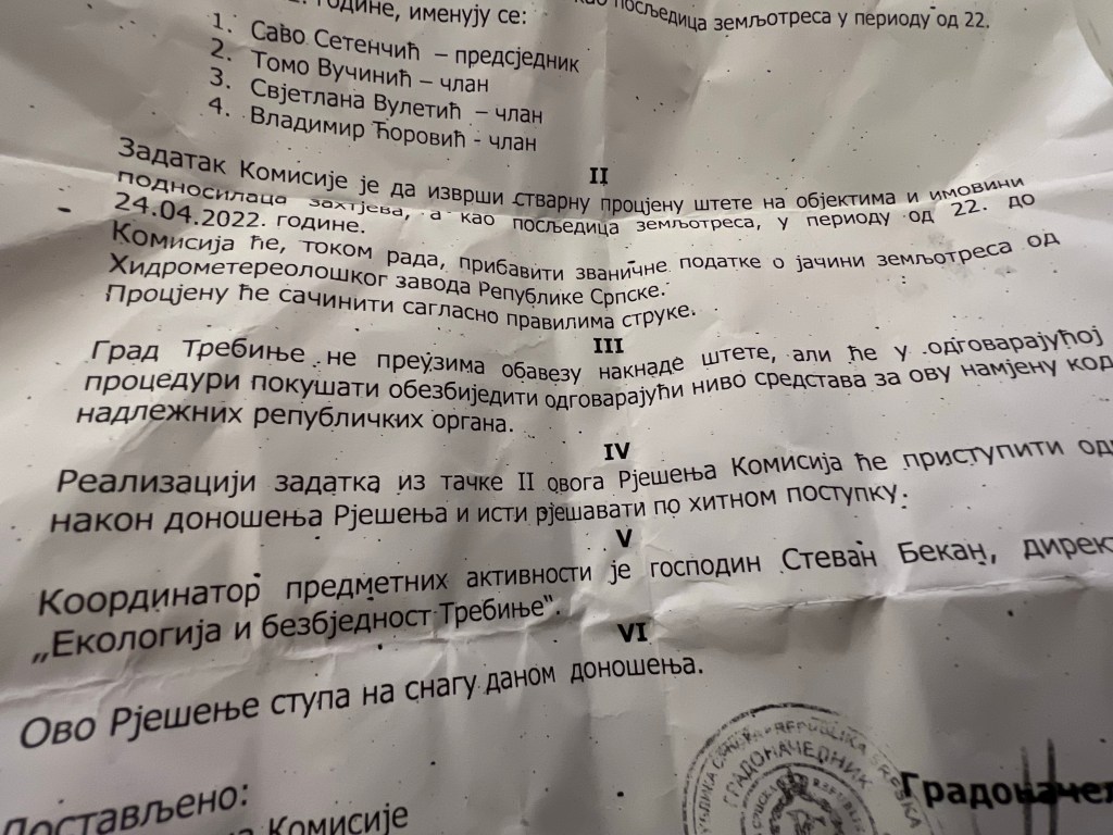 Rješenjem o imenovanju komisije u stavu III piše da: “Grad Trebinje ne preuzima obavezu naknade štete, ali će u odgovarajućoj proceduri pokušati obezbijediti odgovarajući nivo sredstava za ovu namjenu kod nadležnih republičkih organa.”