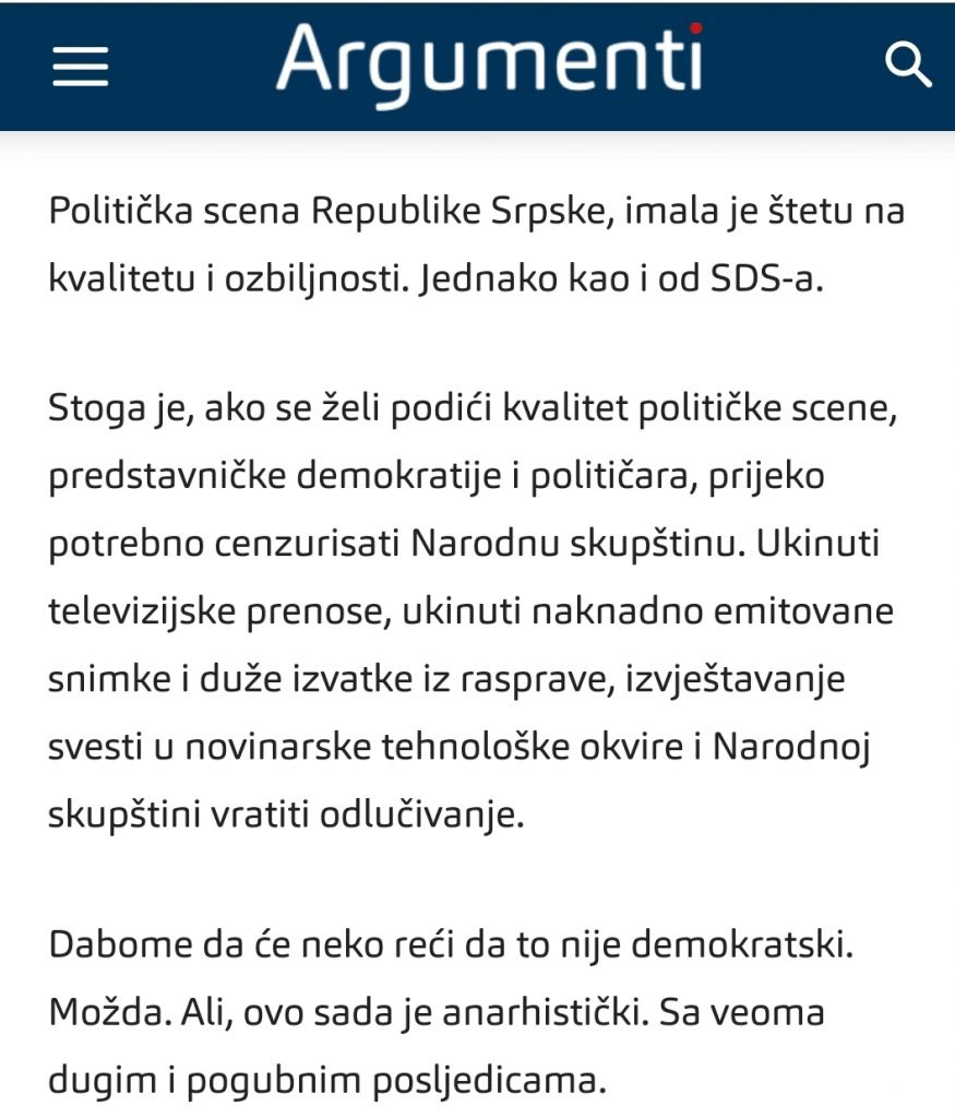 Ako su tako bezgrešni kao što pričaju i ako tako vrtoglavo napredujemo, čemu onda gušenje slobode govora u Narodnoj skupštini Republike Srpske? Čemu onda na stotine lažnih identiteta sa naručenim komentarima?